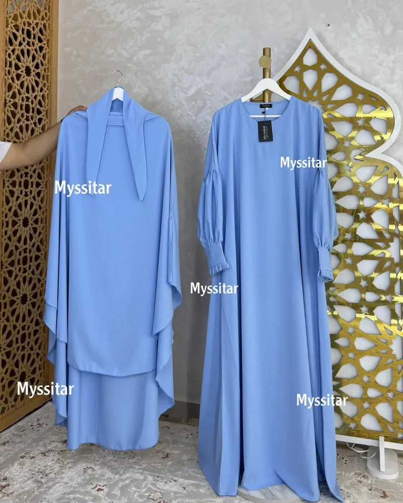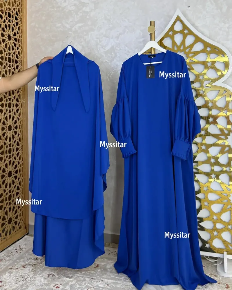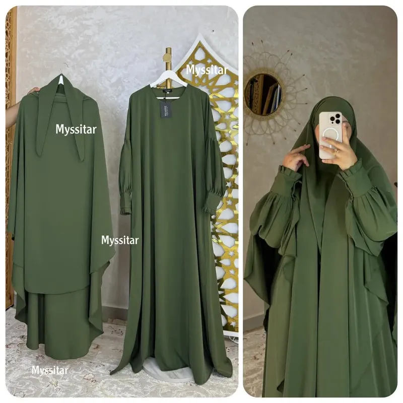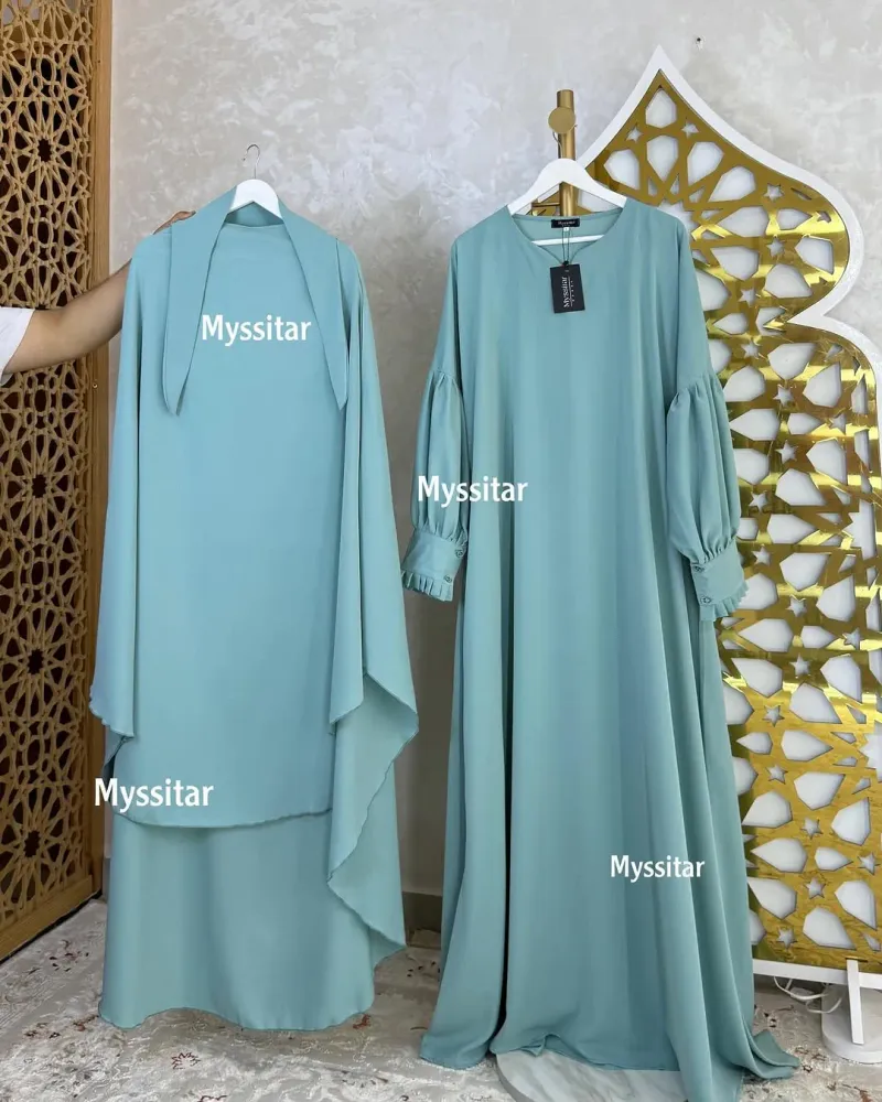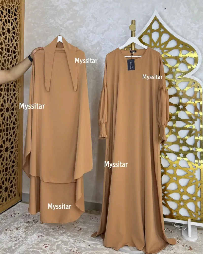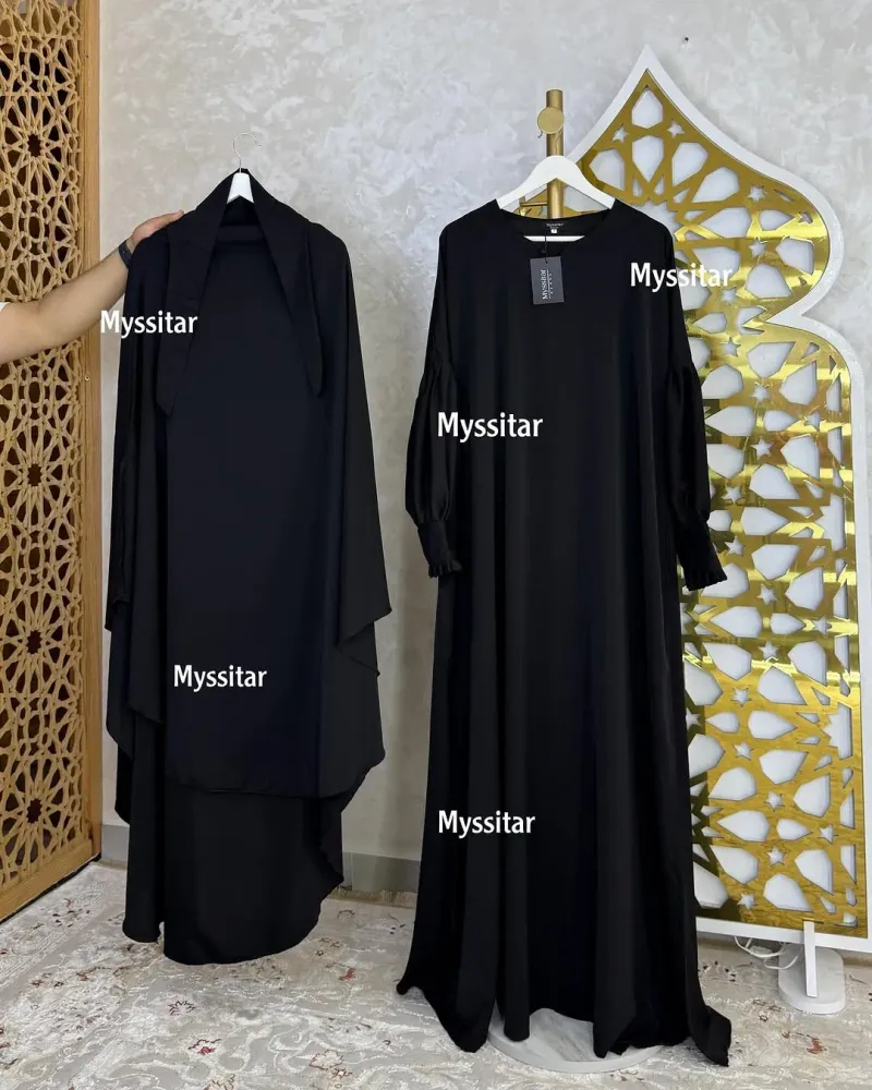 طقم بثوب كريب مكون من قطعتين عباءة بقصة ساترة وخيمار طويل مع فتحتين بالجوانب