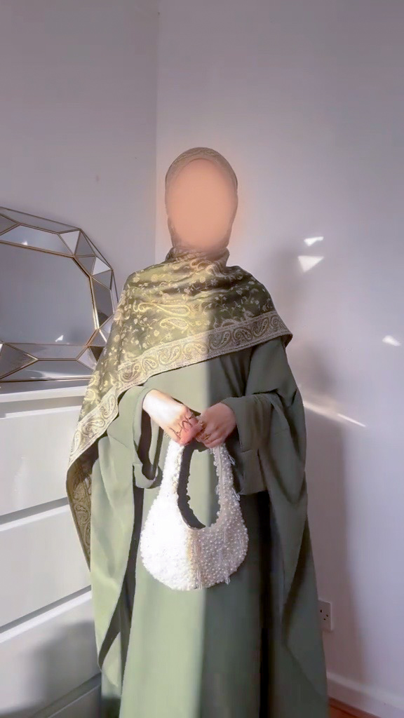 عباية باترفلاي واسعة بلون أخضر أنيق، مصنوعة من قماش الكريب الناعم لراحة وأناقة مثالية في كل إطلالة